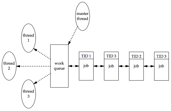 - master thread 可以依照 ID 指派 job 給 worker thread