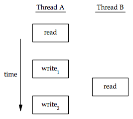 - 上圖若寫入需要花兩個 cycle 而讀取只需一個 cycle,且讀取正好發生在寫入間則產生不一致