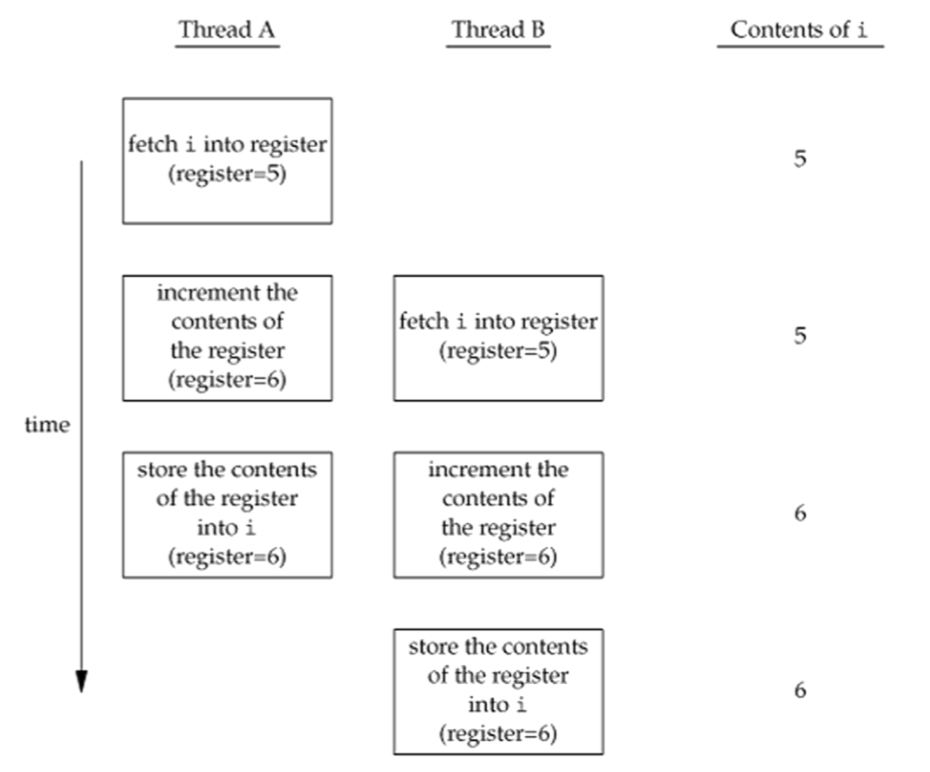 - 上圖若兩個執行緒都要增加一個變數,其中涉及三個動作,此也可能產生不一致