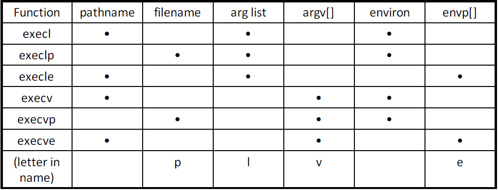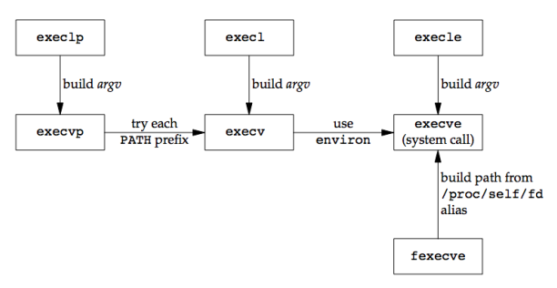 #include <unistd.h> extern char **environ; int execl(const char *pathname, const char *arg0, ...,(char *)0); int execlp(const char *filename, const char *arg0, ...,(char *)0); int execle(const char *pathname, const char *arg0, ...,(char *)0 , char * constenvp[]); int execv(const char *pathname, char *const argv[]); int execvp(const char *filename, char *const argv[]); int execve(const char *pathname, char *const argv[], char *const envp[]); int fexecve(int fd, char *const argv[], char *const envp[]); /* All seven return: −1 on error, no return on success */