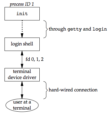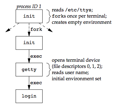 可選擇印出 message-of-the-day(motd),check new mail 或執行其他工作- 至此,login shell 就跑起來了,他的 parent process 為 init,init 會發出 SIGCHID signal,並為這個 terminal 重複一次整個程序
