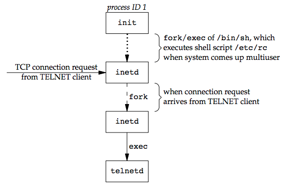 會調用一個 shell 來執行 /etc/rc 這個 shell script,他會啟動 inetd 和其他 daemon,當 /etc/rc 結束後,inetd