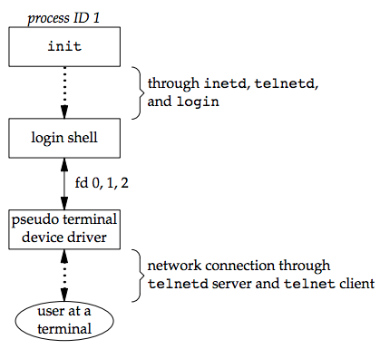 - 為了使 terminal login 和 network login 能用一樣的 program 來 login,software drivcer 會呼叫 pseudo terminal 來將 network login 模擬成 terminal login