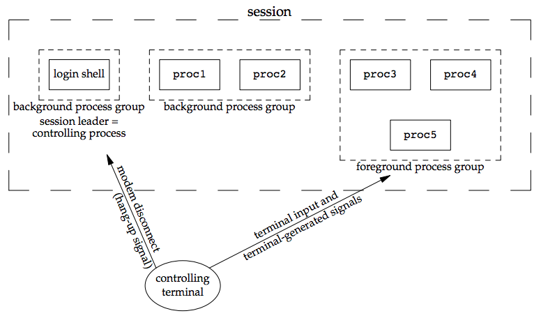 - 如果 session 有 controlling terminal,則必有一個 foreground process terminal,其他則為 background process groups