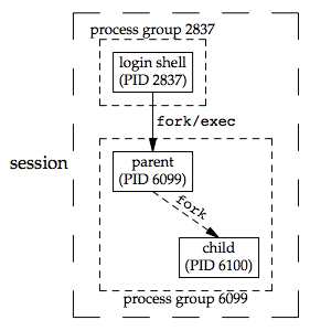 - 若一個 process group 中所有 process 的 parent 皆在跟自己相同的 process group 或是不同 session 的其他 process group,則此為 orphaned process group