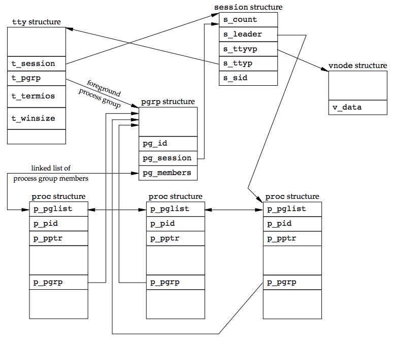 - pg_members: 指向一個 list 包含了此 process group 中成員的 proc structures,proc structure 中的 p_pglist structure 是雙向鏈結串列,指向 process group 中前一個和後一個 process