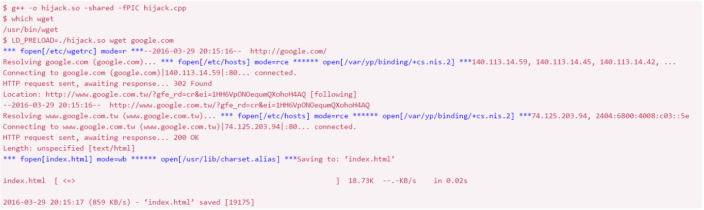 從上方清單中選擇一個 networked client programs,使用 LD_PRELOAD 的方式將自己寫的作業 inject 進去而取得一些程式資訊,將取得的資訊記錄在一個或多個檔案