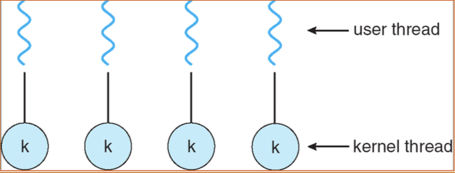 - 產生一個 user thread 時,需連帶產生一個 kernel thread,會佔用較多資源