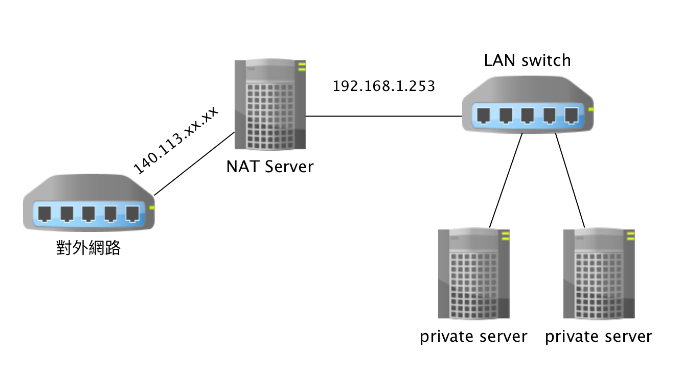 這時我們就會需要 NAT Server 來幫助我們將 private network 轉到 public network 啦