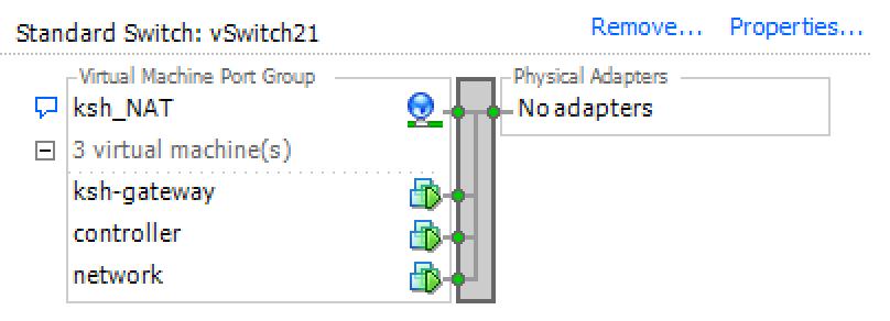 - NAT Server 本身要帶兩張網卡,一張拿 public IP 接到對外網路,一張拿 private IP 接對內網路。下圖 VM network 為對外網路 switch,ksh_NAT 為對內網路 switch